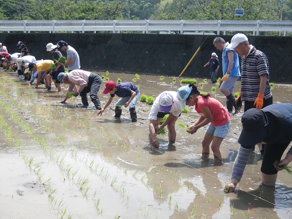 - 道部の田んぼでは、みどりの少年団が社会福祉協議会の方たちに教えていただき、田植え体験を行いました。秋の収穫が楽しみです。