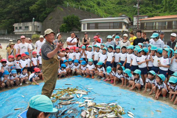 - 岩地海岸では、賀茂地区の2つの保育園が合同で地引網体験を行いました。