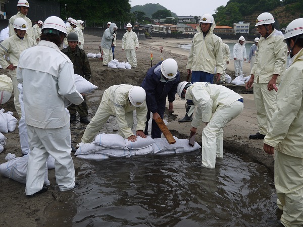 - 岩地海岸では、松崎町消防団が陸上自衛隊の隊員を指導者に迎え、土のうの作り方等の水防工法を学ぶ、水防訓練が行われました。