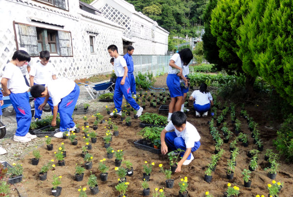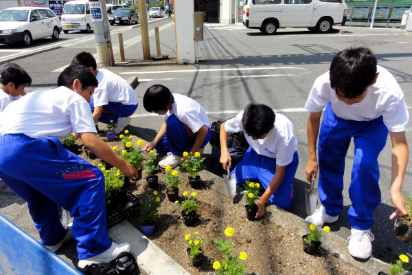 - 松崎のバスターミナル向かいの花壇では、松崎中学校の美化委員の生徒たちが、マリーゴールド等の花の苗の植栽を行いました。