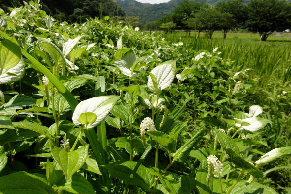 - 南郷地区鮎川では、ハンゲショウが自生しています。ハンゲショウは、葉の表面の一部が白く変化するのが特徴的です。