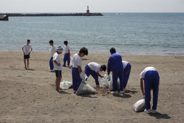 - 松崎海岸と外部海岸では、松崎中学校の生徒たちが、清掃活動を通して、身の回りの環境について考える機会を持つことを目的に、海岸の清掃活動を行いました。