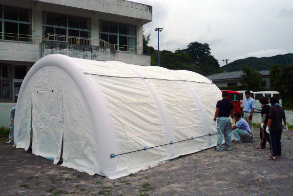 - 旧中川小学校のグラウンドでは、災害用に備蓄してあるエアーテントの組み立てが行われました。