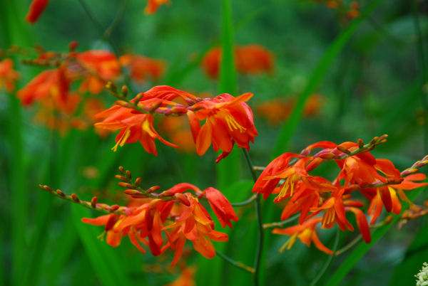 - ヒメヒオウギズイセンが咲いているのを見つけました。朱色の花がとても鮮やかです。