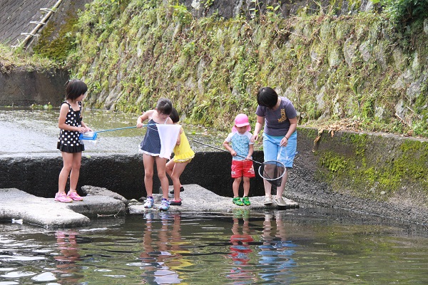 - 大沢の河原では中川幼稚園の家族参観日が行われました。園児は家族やお友達と魚や川エビとりを楽しんでいました。