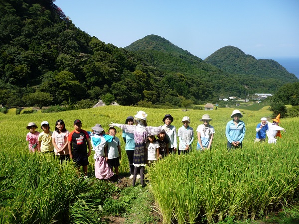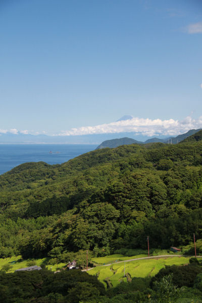 - 同じく石部の棚田では、稲が穂を付け、日に日に元気に成長しています。10月4日(土)と5日(日)には収穫祭が予定されています。展望台からは、遠くに富士山を見ることができました。
