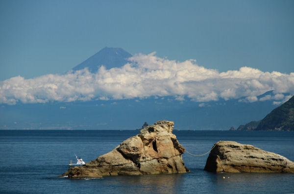 - 今日は、久々に青空の広がる一日となりました。雲見海岸では、正面に見える富士山の写真を撮ろうと多くの人が訪れていました。