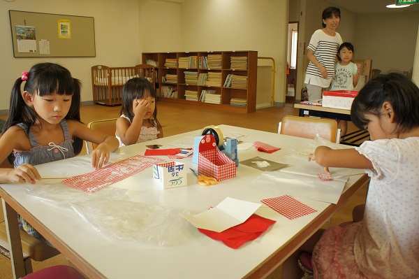 - 児童館では、敬老の日に向けたプレゼントつくりが行われ、参加した子供たちは、牛乳パックを使った小物入れをつくっていました。