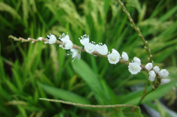 - 石部の棚田では、シロバナサクラタデの花が白く小さい花を咲かせていました。