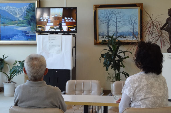 - 役場窓口税務課前と環境センターロビーに設置してある専用テレビでは、議場の様子が生中継されていますので、どうぞお気軽にお出かけください。