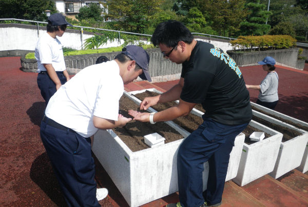- 東部特別支援学校伊豆松崎分校の生徒さんに、役場正面玄関前の花壇の種まきを行っていただきました。