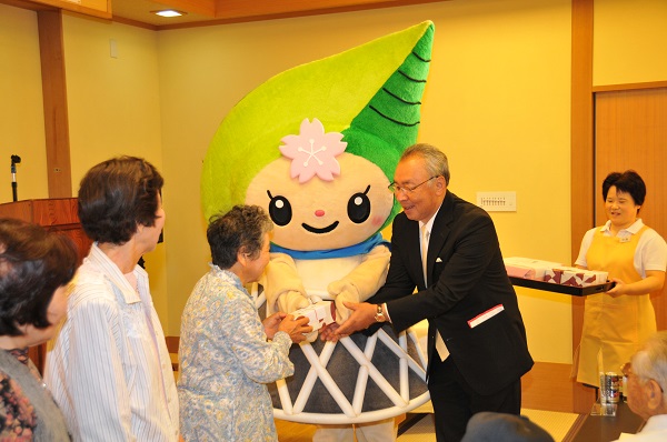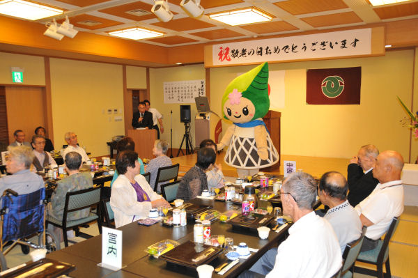 - 伊豆まつざき荘では、松崎地区と宮内地区合同で敬老の日の行事が開催されました。会場には松崎町マスコットキャラクター「まっちー」も訪れ、お祝いしました。