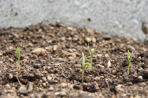 - 先日、東部特別支援学校伊豆松崎分校の生徒に蒔いていただいたコスモスの種が芽を出し始めました。