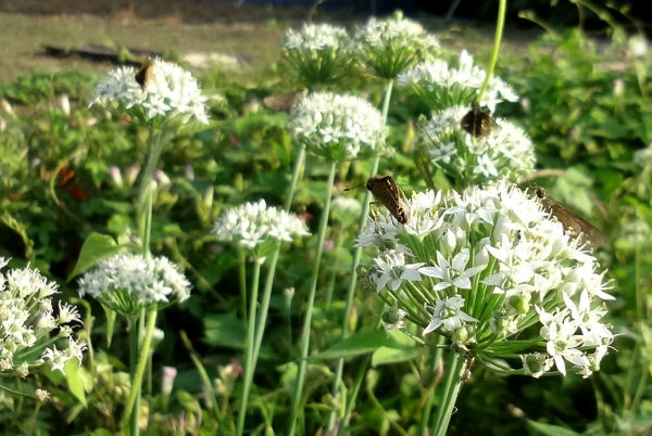 - 重文岩科学校前に咲いているニラの花にイチモンジセセリがとまっていました。