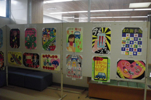 - 図書館前のロビーでは、町内の小中学生が夏休みに描いた交通安全ポスターの入賞作品の展示が始まりました。
