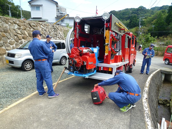 - 松崎町消防団では、分団査察が行われました。出動時に備え、本部員と町の監査委員が全小隊のチェックを行いました。