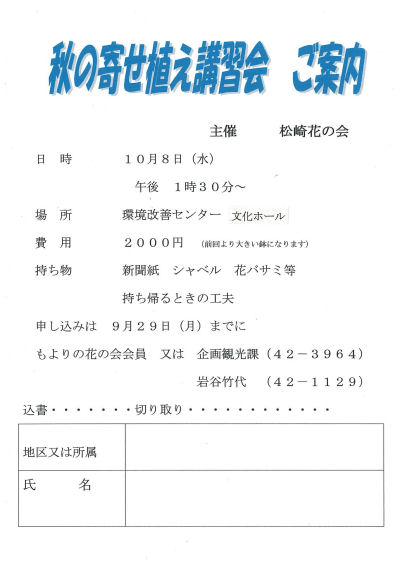- 環境センター大会議室では、松崎町花の会の会合が行われ、今後の活動内容について話し合いました。10月8日(水)には、花の会主催による寄せ植え講習会が開催されます。皆様のご応募をお待ちしております。