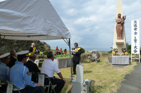 - 外部の交通安全誓いの塔では、交通安全を誓う大会が行われました。会場では、交通事故によりお亡くなりになられた方へ哀悼の意を表し、献花が行われました。