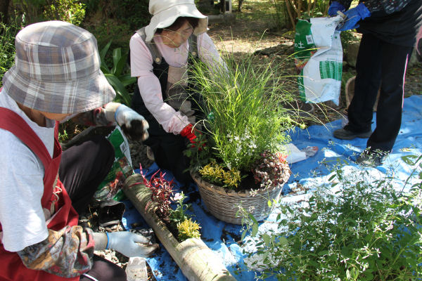- 伊豆文邸では、花の会の方々が民具を使った花の寄せ植え作りを行いました。