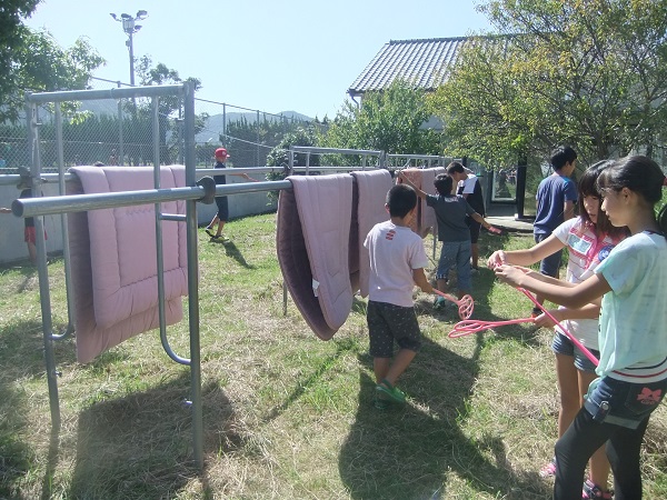 - 松崎高校龍門館では、10月2日から2泊3日で行われる小学校4〜6年生を対象にした「まつざきっ子通学合宿」に向け、参加する児童が集まり、合宿で使う布団を干しました。