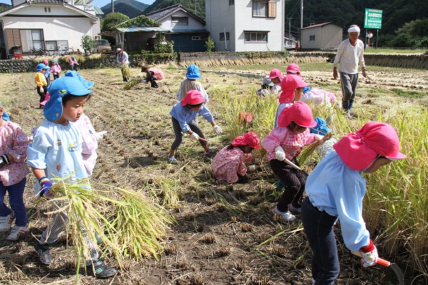 - 昨日の話題ですが、松崎幼稚園中川園の児童らが、稲刈りを体験しました。