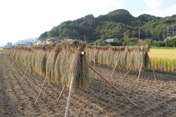 - 町内の田んぼでは、稲刈りが始まっています。稲刈りが終わった田んぼでは、稲をはざがけしている風景を見ることができます。
