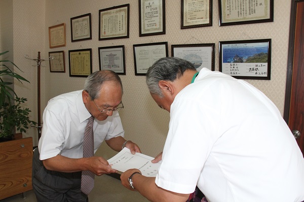 - 役場応接室にて10月1日から新たに教育委員となられる杉山公一さんに任命書が渡されました。