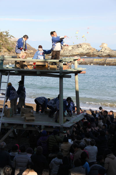 - 雲見海岸では、漁業の安全と豊漁を祈願する新春恒例の乗り初めが行われました。海岸に設置されたやぐらからはお菓子やお餅がまかれ、それを拾おうと多くのお客様が訪れました。