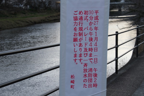 - 明日の午後から消防団出初め式パレード及び一斉放水が行われるため交通規制を実施しますので、御協力を御願いいたします。