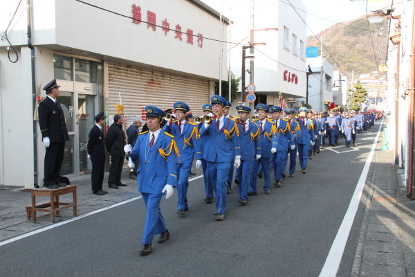 - 松崎小学校グラウンドでは、松崎町消防団出初式が行われ、式典において20年勤続功労章等の表彰が行われました。式典終了後は、消防団ラッパ隊や団員、消防車が町内をパレードしました。