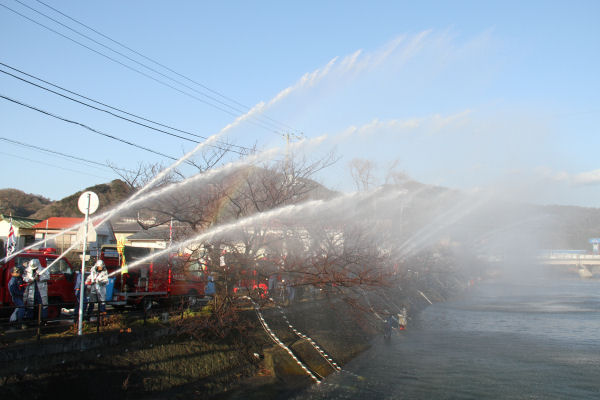 - 町内パレード終了後には、那賀川沿いで一斉放水が行われました。