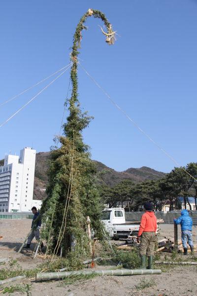 - 町内各所にて、賽の神づくりが行われました。写真は、松崎海岸で行われた松崎地区の賽の神づくりの様子です。