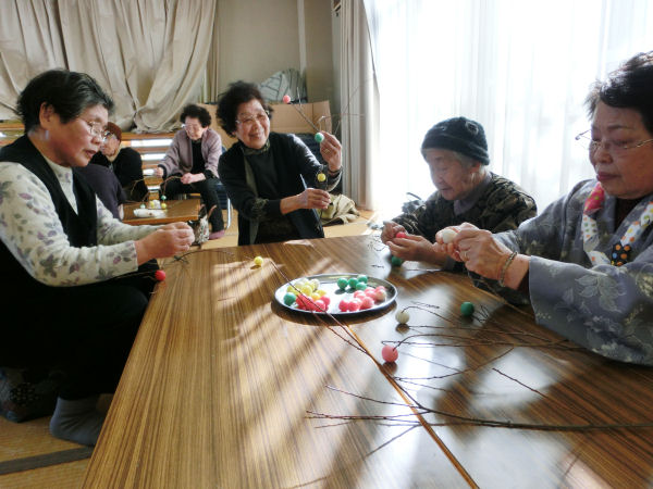 - 福祉センターでは、松崎サロンが開催されました。月に一度開催されているサロンでは、季節に合わせた催しを参加者全員で楽しんでいます。年始の今回は、小正月にあわせ餅花を作り、参加者は楽しい時間をすごしました。