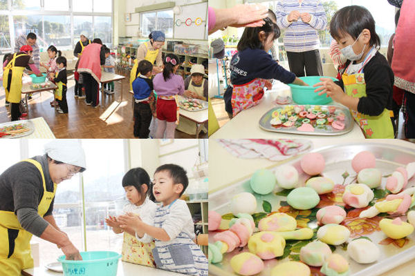 - 松崎幼稚園岩科園では、どんど焼きのお団子作りが行われました。園児たちは、赤や白、緑色等に着色された生地で、好きな形のお団子を作りました。作ったお団子は持ち帰り、各家庭や各地区のどんど焼きで食べる予定です。