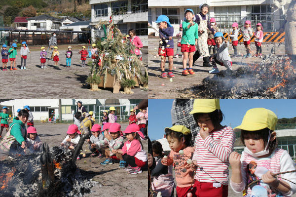 - 松崎幼稚園中川園でもどんど焼きのお団子作りが行われました。中川園では、園児たちが家から持ち寄ったお正月飾りで作った賽の神に火を入れどんど焼きを行い、作ったお団子をその場で味わいました。