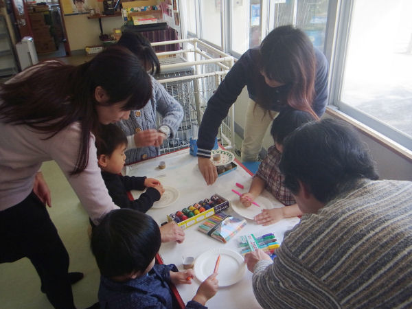 - 児童館では、育児グループが開催されました。今日はお正月らしく、福笑い、かるた取り、コマ作りが行われ、参加した子どもたちは楽しい時間を過ごしました。