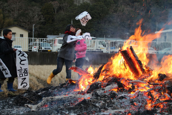 - 今朝、町内各所で五穀豊穣や無病息災を願いどんど焼きが行われました。道部区では、子どもたちが字の上達を願い、書初めを燃やしました。