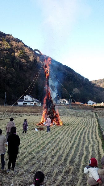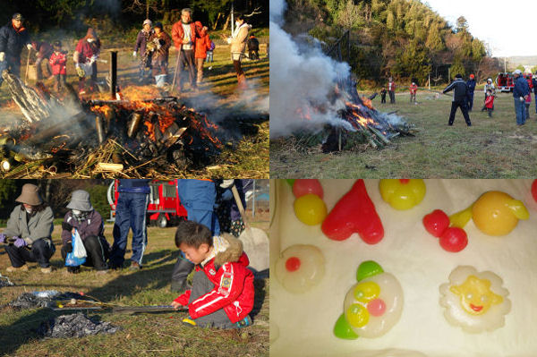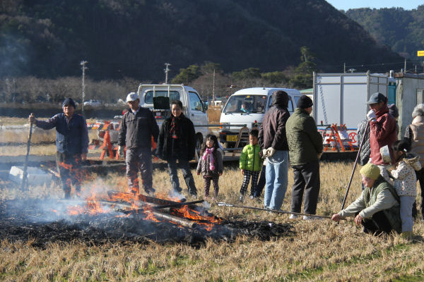 - 宮内区の田んぼでは、どんど焼きが行われました。 参加した子どもたちは焼きあがったお団子やお芋を美味しそうに頬張っていました。
