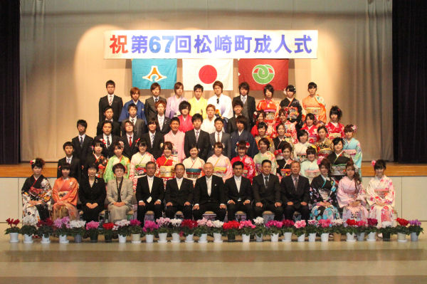 - 環境改善センター文化ホールにて、第67回松崎町成人式が行われました。第1部の式典では、町長や議長から新成人へお祝いの言葉があり、新成人代表からは宣誓が行われました。