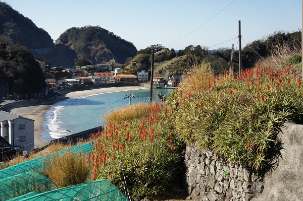 - 町内各所にあるアロエが赤い花を咲かせ、見頃を迎えています。写真は岩地地区のアロエです。