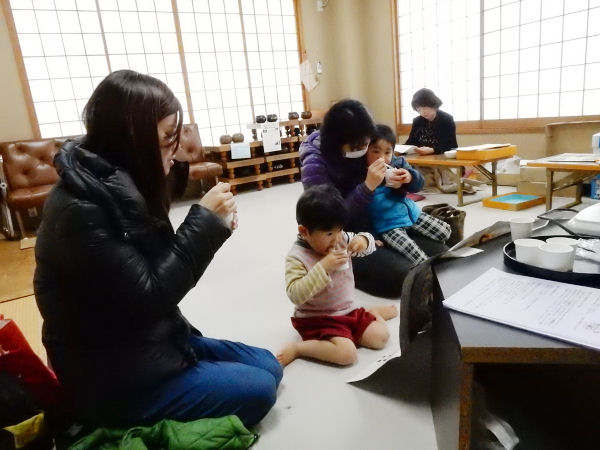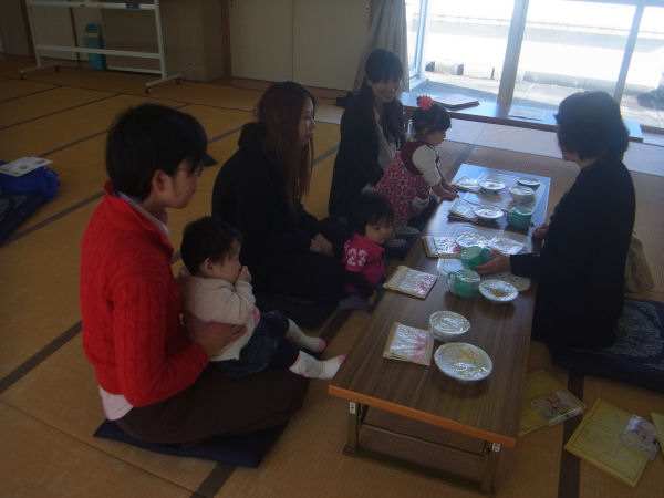 - 福祉センターでは乳幼児健診が行われ、来場したおかあさんたちに松崎町健康づくり食生活推進協議会の方たちが作った天然だしの具だくさんみそ汁を試食していただきました。