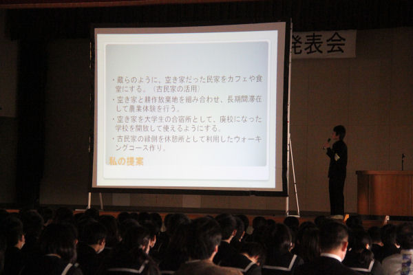 - 昨日の話題ですが、松崎高校体育館で、西豆学合同発表会が行われました。 発表会では、西豆地区3中学校と松崎高校1年生が、西豆について調べたことや職場体験から学んだことを発表しました。