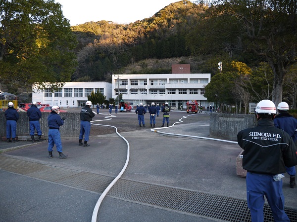 - 1月26日の文化財防火デーにちなんで、重要文化財岩科学校周辺において、松崎町消防団と西伊豆消防署が合同訓練を行いました。