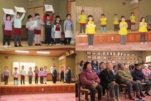 - 松崎幼稚園岩科園の園児たちが石部地区を訪問し、歌や踊りを披露しました。最後に披露した「幸せなら手をたたこう」の歌では、園児たちは会場内を歌いながら地元の方の肩を叩いて回りました。