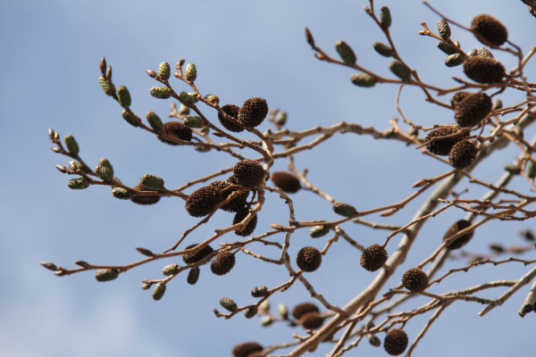 - ハンノキ属の木でしょうか。国道沿いに生えている木に松ぼっくりのような実がついていました。