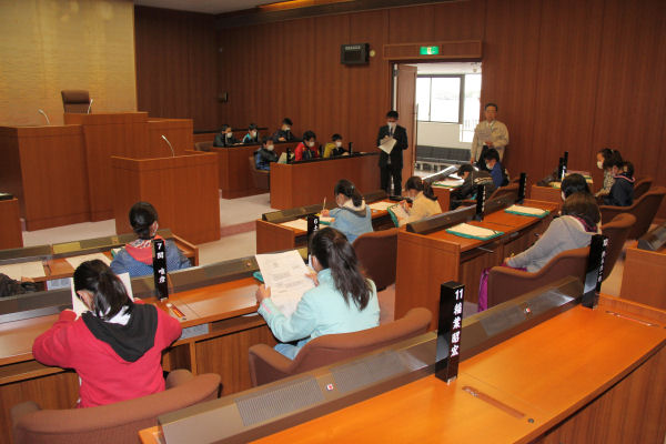 - 松崎小学校の6年生が役場を見学に訪れました。生徒たちは、役場議場にて役場の仕事について説明を受け、庁舎内を見学しました。