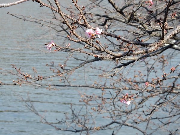 - 本日は風もなく、温かい日中となっています。春の訪れを感じてか、那賀川しんしま橋付近の早咲きの桜が開花し始めています。