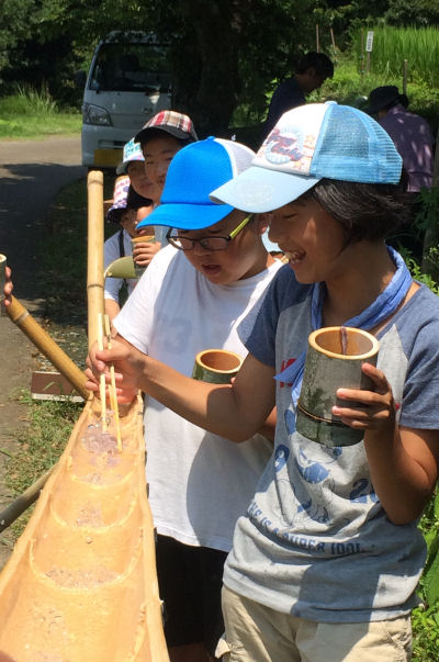- 同じく棚田百笑くらぶでは、フィールドビンゴ後に夏の風物詩である流しそうめんを行いました。子どもたちは、自分たちで竹から作った器とはしで、棚田黒米そうめんを食べました。