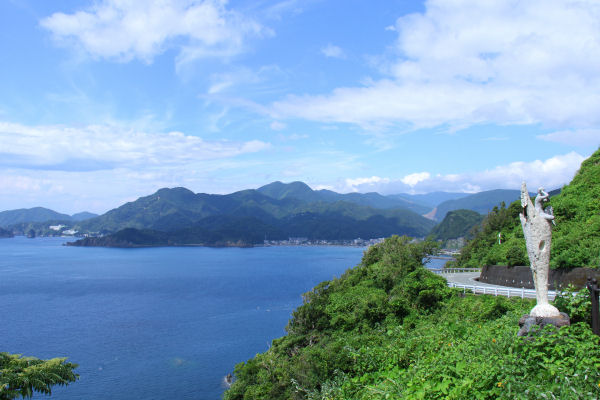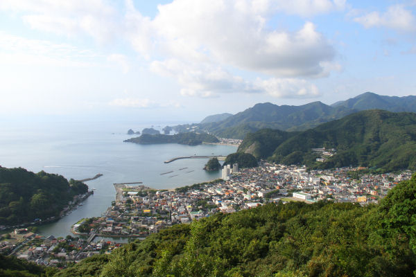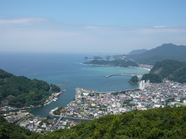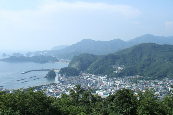 - 牛原山からの町の景色です。多少雲はありますが、美しい青い海と町並みを一望することができます。