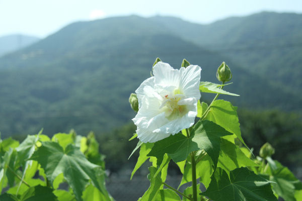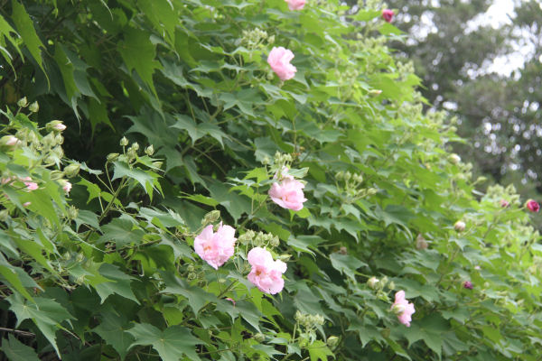 - 吉田地区では、まだまだつぼみが多いですが、酔芙蓉(すいふよう)の花が咲き始めています。